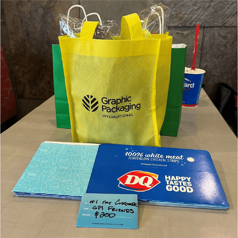 What followed was a true team effort. Working together, our colleagues tracked down a supply of the original blue fry cartons from Canada. The team didn’t just ship them — they personally delivered 1,000 cartons to the family at their local DQ® restaurant, along with Graphic Packaging branded gifts and a DQ® gift card, celebrating Isaiah as the restaurant’s #1 French Fry Customer.
