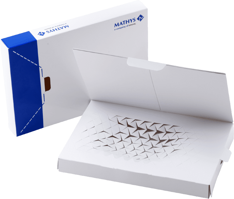 Mathys AG’s previous packaging relied on non-recyclable polyurethane foam inserts and required multiple SKUs to accommodate different implant sizes. This approach did not support Mathy AG’s sustainability goals and was also operationally complex, prompting the need for a complete redesign.